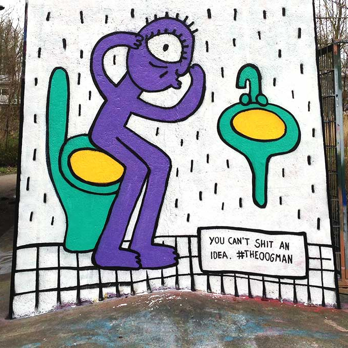 The Oogman (Eyeman) is a character born in Amsterdam, conceived by Italian artist and art director, Cecilia Pignocchi. The graphic approach and simplicity comes from a graphic design background. And the style is of course inspired by Keith Haring. Not only in the choice of colours and thick black lines, but also for the media, scale and thematics. The Oogman began on paper, wood and canvas, before eventually making his way onto the streets of various cities, as murals and stickers. Each piece must start with a simple human insight or experience. Oogman has a childlike curiosity and an uninhibited hedonism that is often expressed through sex - in a fun and exploratory way, rather than for titillation. In the Oogman universe, everyone looks the same. It's a way of talking about humanity where in the end we all belong to the same species, therefore we are all the same. Through his ever-present eye he conveys his emotions of wonder, revelation, excitement, fear and love.